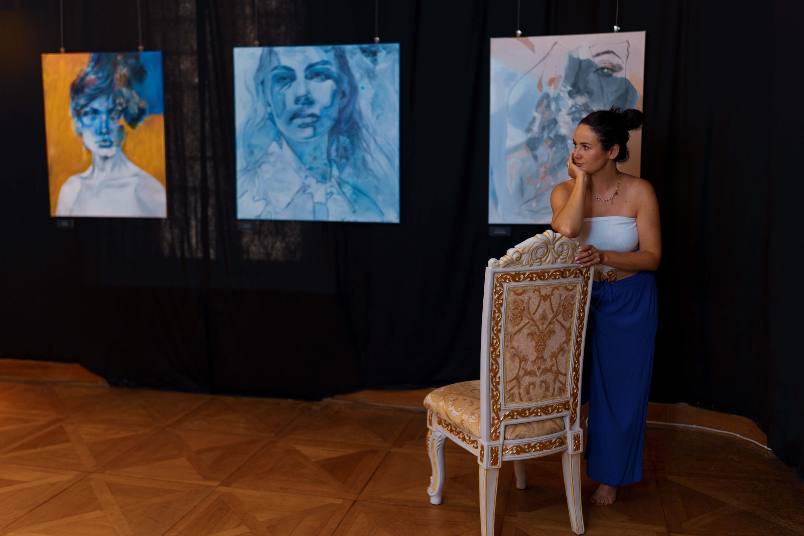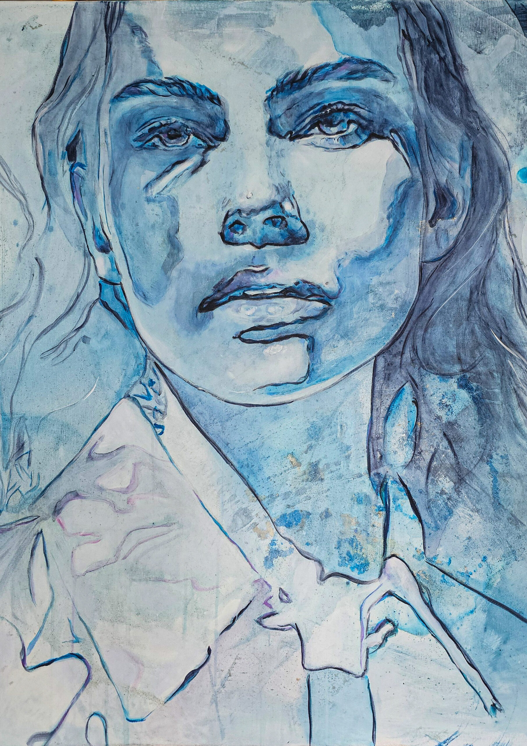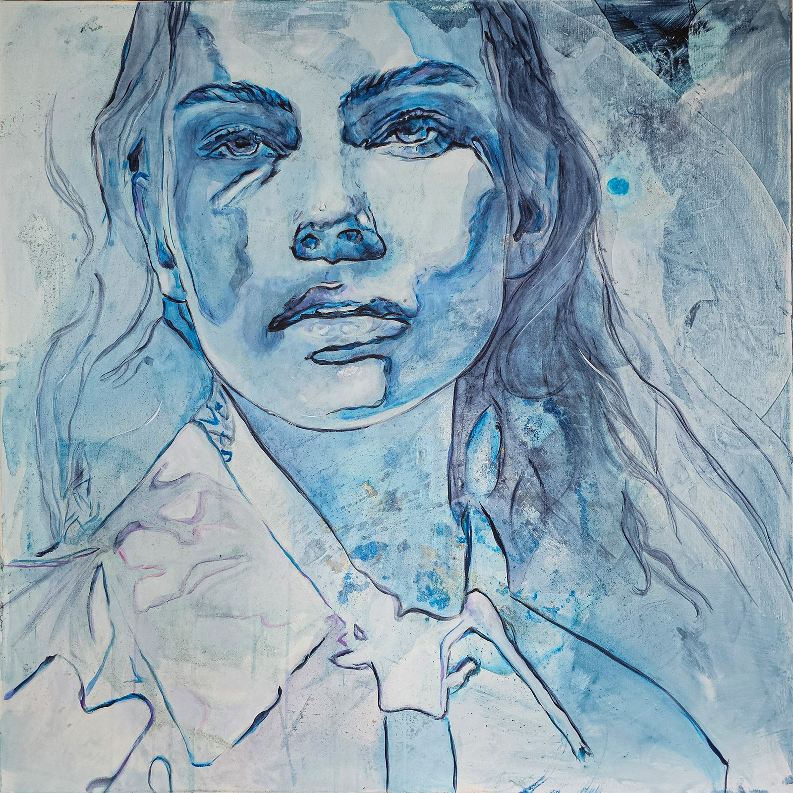 Połączenie ekspresyjnych pociągnięć pędzla z precyzyjnie zaznaczonym konturem, tworząc portret o niezwykłej głębi emocjonalnej i eterycznej aurze.